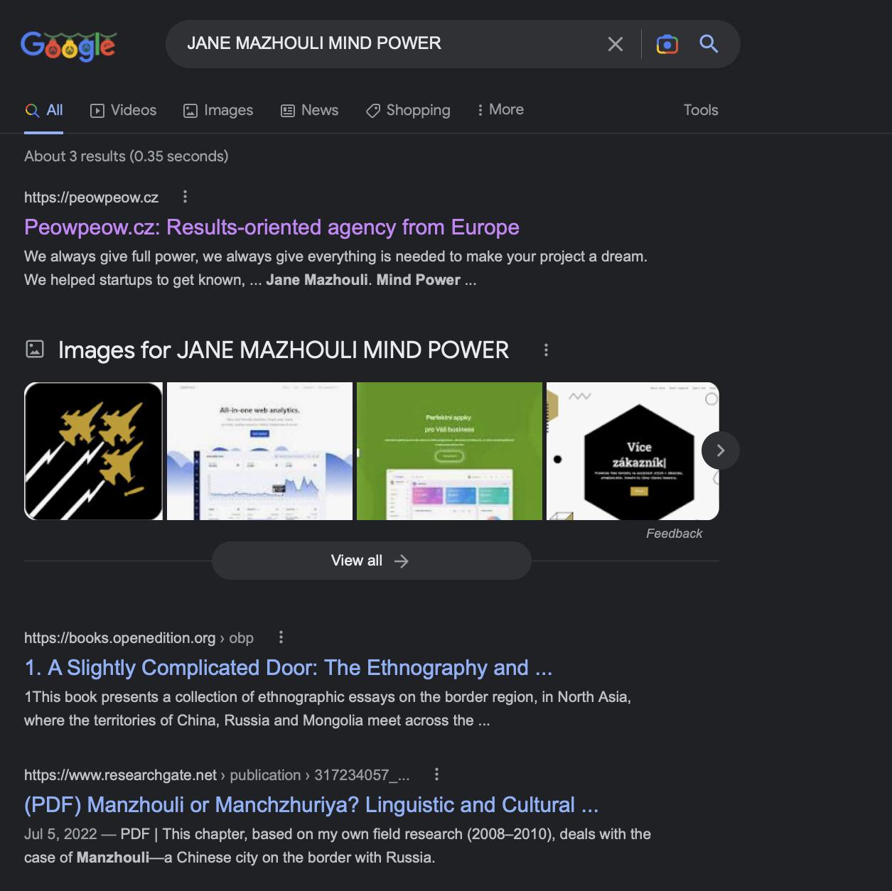 Zůstaňme ale chvilku na strance peowpeow.cz. Na stránkách se opakovaně vyskytuje citace spokojených zákazníků. Zkuste zkopírovat a vyhledat jejich jméno. Že vám to nic relevantního nenašlo? Zajímavé, že?